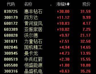 早盤,A股培育鉆石概念大漲。截至午盤,北交所個(gè)股惠豐鉆石收獲30%幅度漲停,黃河旋風(fēng)(600172)、亞振家居(603389)漲停,四方達(dá)(300179)漲超10%。