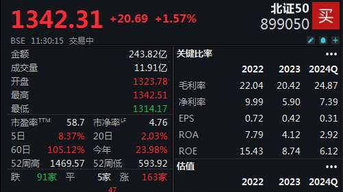 兩市震蕩分化,北證50半日漲幅達(dá)1.57%