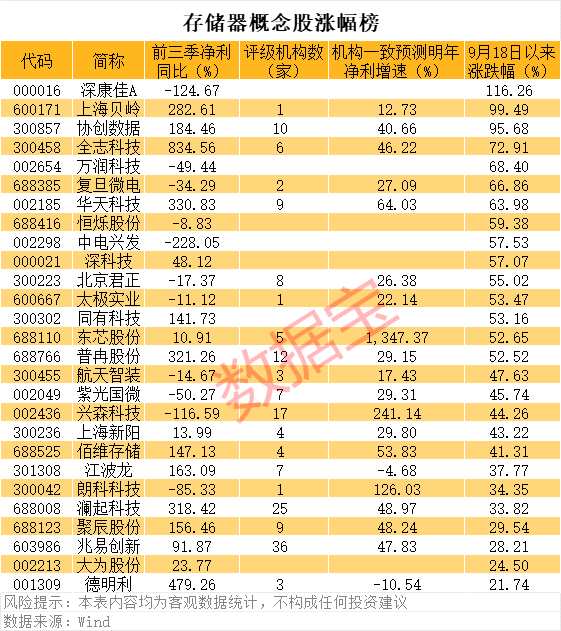 今年前三季存儲概念股業(yè)績表現(xiàn)亮眼,全志科技(300458)、德明利(001309)、華天科技(002185)等11股凈利同比翻倍增長。展望2025年,存儲概念股或?qū)⒀永m(xù)增長態(tài)勢,機構(gòu)一致預(yù)測18股凈利同比增長。從市場表現(xiàn)來看,概念股9月18日以來平均漲幅接近54%,遠遠跑贏大市,深康佳A、上海貝嶺(600171)、協(xié)創(chuàng)數(shù)據(jù)(300857)等個股均大漲逾90%。