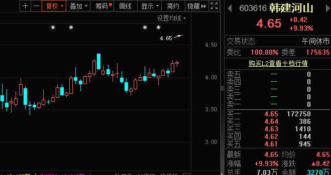 韓國政壇動蕩,A股又掀起一波相關(guān)玄學(xué)題材股,其中尤以韓建河山(603616)最為火爆,已經(jīng)進入多個炒股APP熱股榜前列,今天該股開盤直接漲停,整個上午保持一字漲停態(tài)勢。