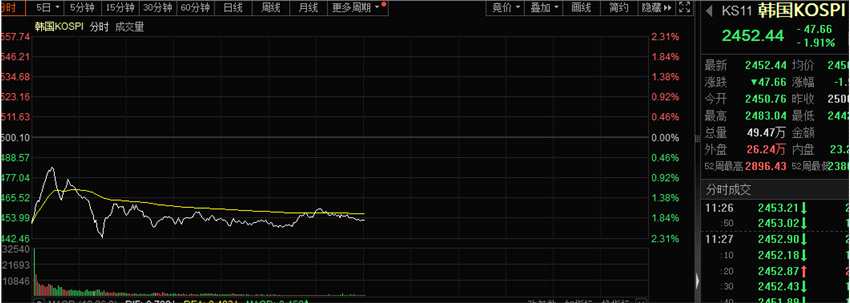 雖然韓國金融委員會委員長金秉煥表示10萬億韓元(約合515億人民幣)股市平準(zhǔn)基金將隨時投入運行,但韓國股市今天早盤依舊大幅下挫,盤中一度跌逾2%。