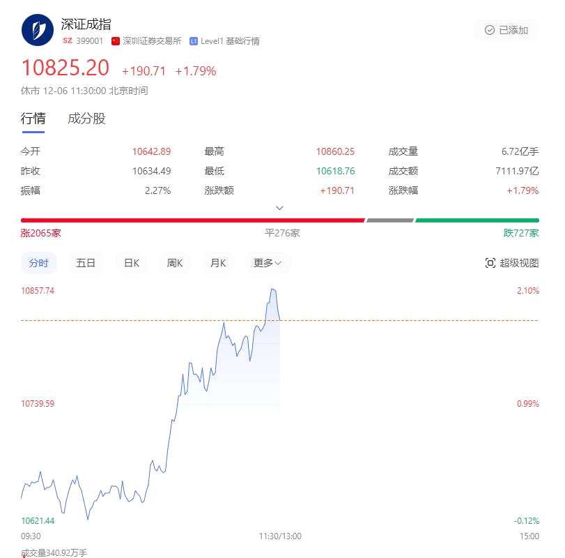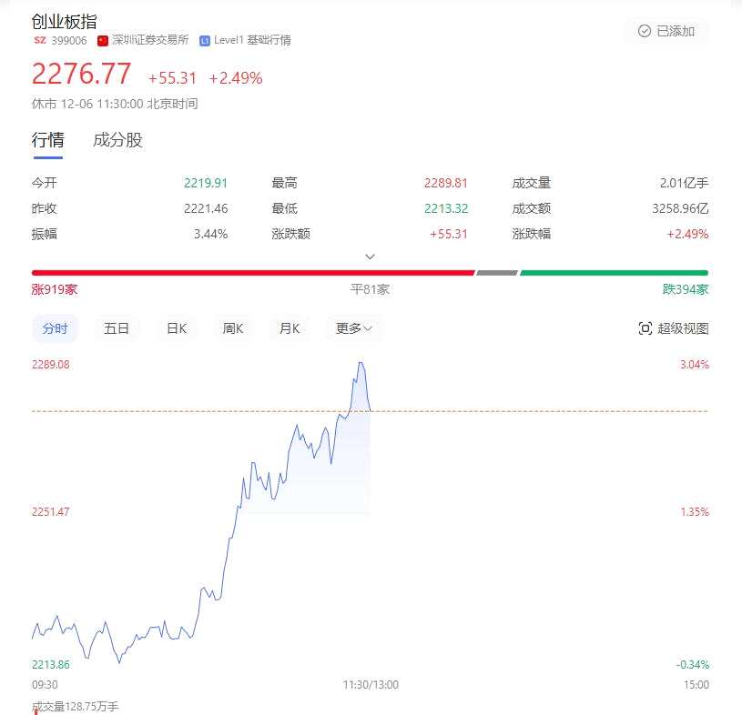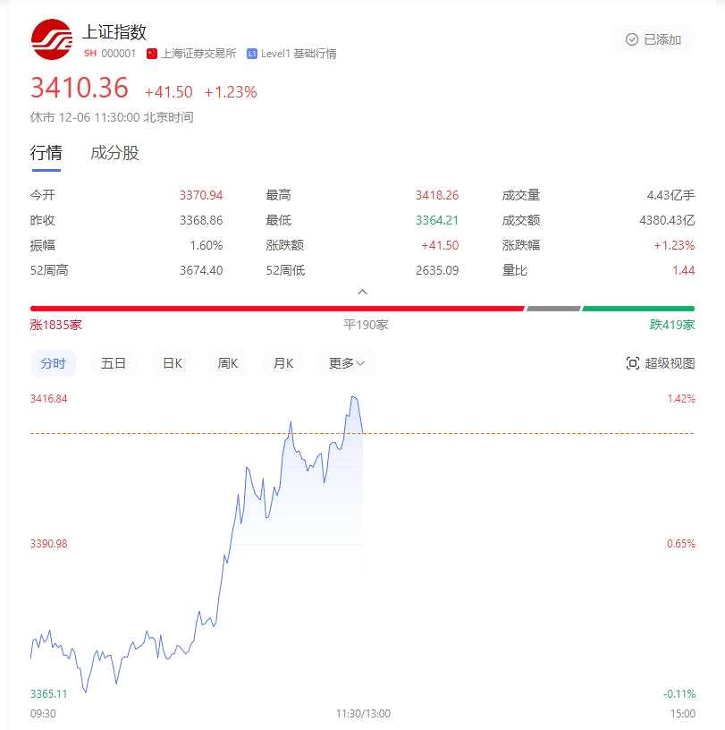 截至上午收盤,滬指報(bào)3410.36點(diǎn),漲1.23%;深指收報(bào)10825.2,漲1.79%;創(chuàng)業(yè)板收報(bào)2276.77點(diǎn),漲2.49%。全市場半日接近4000家股票上漲,成交額1.15億,較上個(gè)交易日放量2183億。