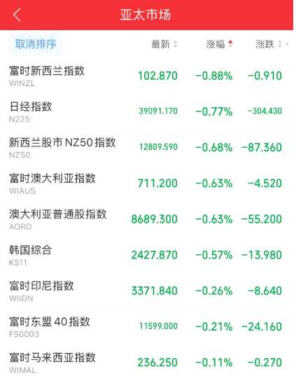 而亞太市場普遍下跌。日經(jīng)指數(shù)跌0.77%,韓國股市跌0.57%。