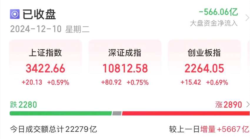 今日,A股三大指數(shù)高開,全天震蕩走弱。截至收盤,滬指漲0.59%,深證成指漲0.75%,創(chuàng)業(yè)板指漲0.69%。市場全天成交超2.2萬億元,較前一交易日增加5667億元,這是滬深兩市成交額自2024年11月13日以來再度突破2萬億元。