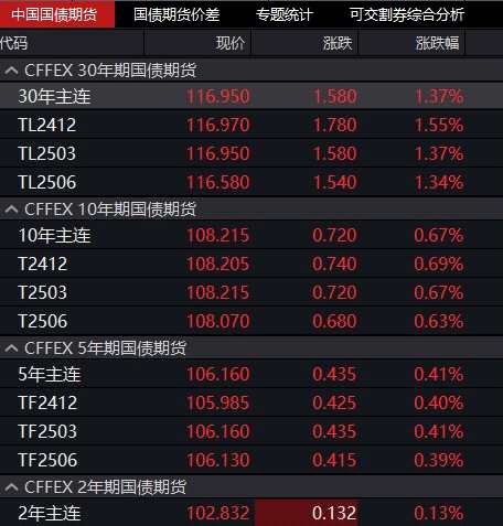國債期貨午后漲幅擴大,截至收盤,30年期主力合約漲1.37%、10年期主力合約漲0.67%、5年期主力合約漲0.41%、2年期主力合約漲0.13%,均創(chuàng)收盤價新高。