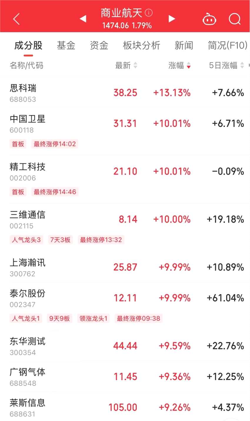 今日,商業(yè)航天概念持續(xù)上漲,中國衛(wèi)星(600118)、三維通信(002115)、精工科技(002006)等漲停。