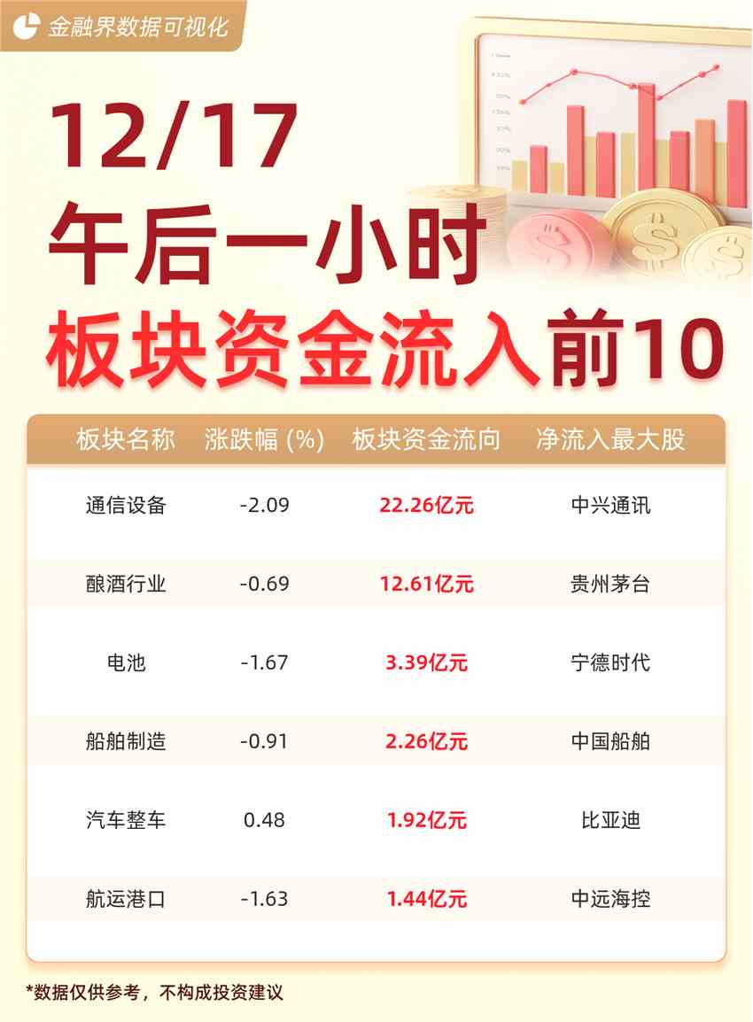 截至12月17日午后一小時(shí),大盤主力資金凈流出682.04億元。主力資金流入前十大板塊分別為:通信設(shè)備(22.26億元)、釀酒行業(yè)(12.61億元)、電池(3.39億元)、船舶制造(2.26億元)、汽車整車(1.92億元)、航運(yùn)港口(1.44億元)。