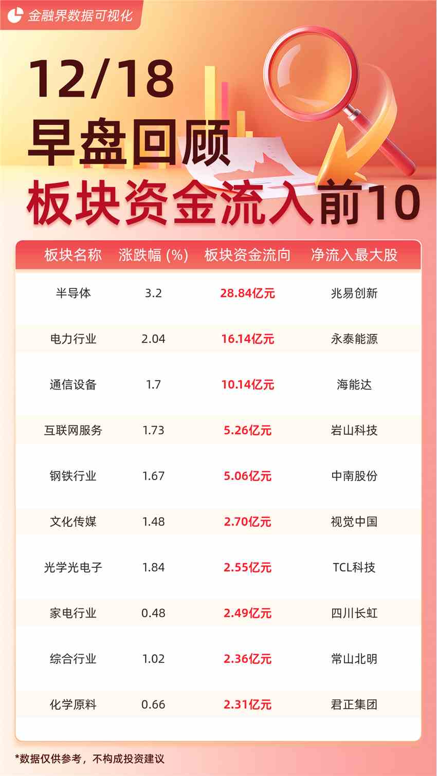截至12月18日午間收盤,大盤主力資金凈流出20.10億元。主力資金流入前十大板塊分別為:半導(dǎo)體(28.84億元)、電力行業(yè)(16.14億元)、通信設(shè)備(10.14億元)、互聯(lián)網(wǎng)服務(wù)(5.26億元)、鋼鐵行業(yè)(5.06億元)、文化傳媒(2.70億元)、光學(xué)光電子(2.55億元)、家電行業(yè)(2.49億元)、綜合行業(yè)(2.36億元)、化學(xué)原料(2.31億元)。