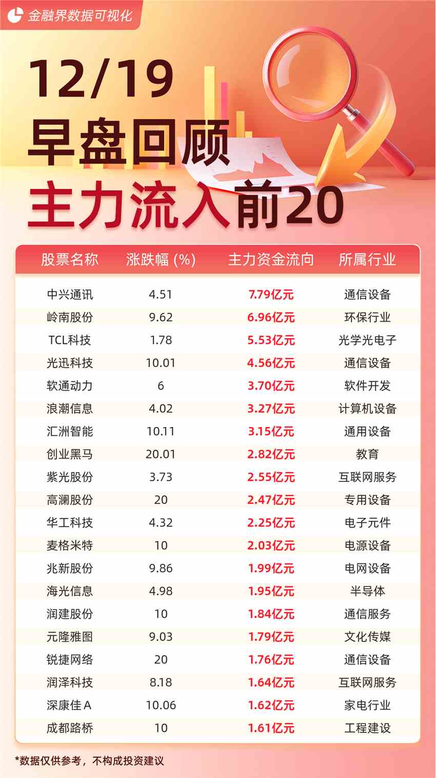 摘要: 截至12月19日午間收盤,主力資金流入前20的股票分別為:中興通訊(000063)(7.79億元)、嶺南股份(002717)(6.96億元)、TCL科技(000100)(5.53億元)、光迅科技(00