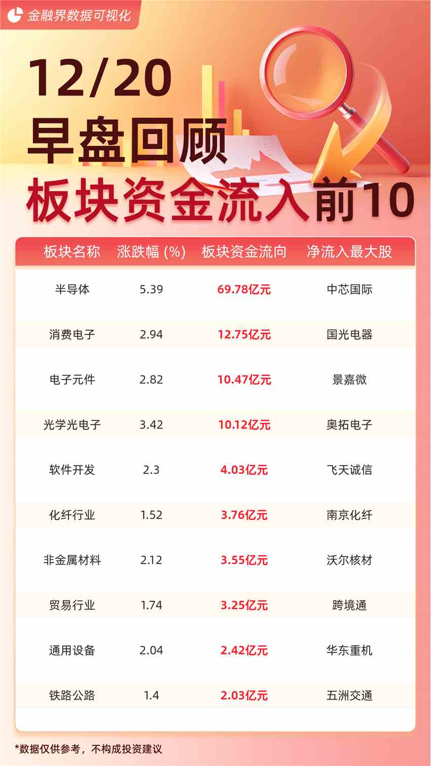 摘要: 截至12月20日午間收盤,大盤主力資金凈流出17.47億元。主力資金流入前十大板塊分別為:半導(dǎo)體(69.78億元)、消費(fèi)電子(12.75億元)、電子元件(10.47億元)、光學(xué)光電子(10.12億元)