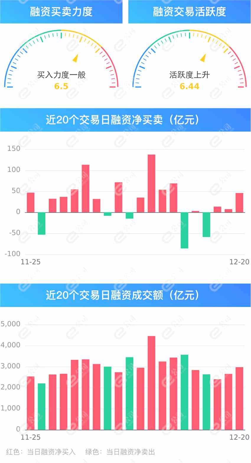 截至12月20日,上交所融資余額報(bào)9597.00億元,較前一交易日增加31.95億元;深交所融資余額報(bào)9114.16億元,較前一交易日增加13.71億元;兩市合計(jì)18711.15億元,較前一交易日增加45.67億元,融資交易額2971.10億元,占A股成交額19.61%,其中融資買(mǎi)入額1508.38億元,融資償還額1462.72億元,交易活躍度上升11.94%。