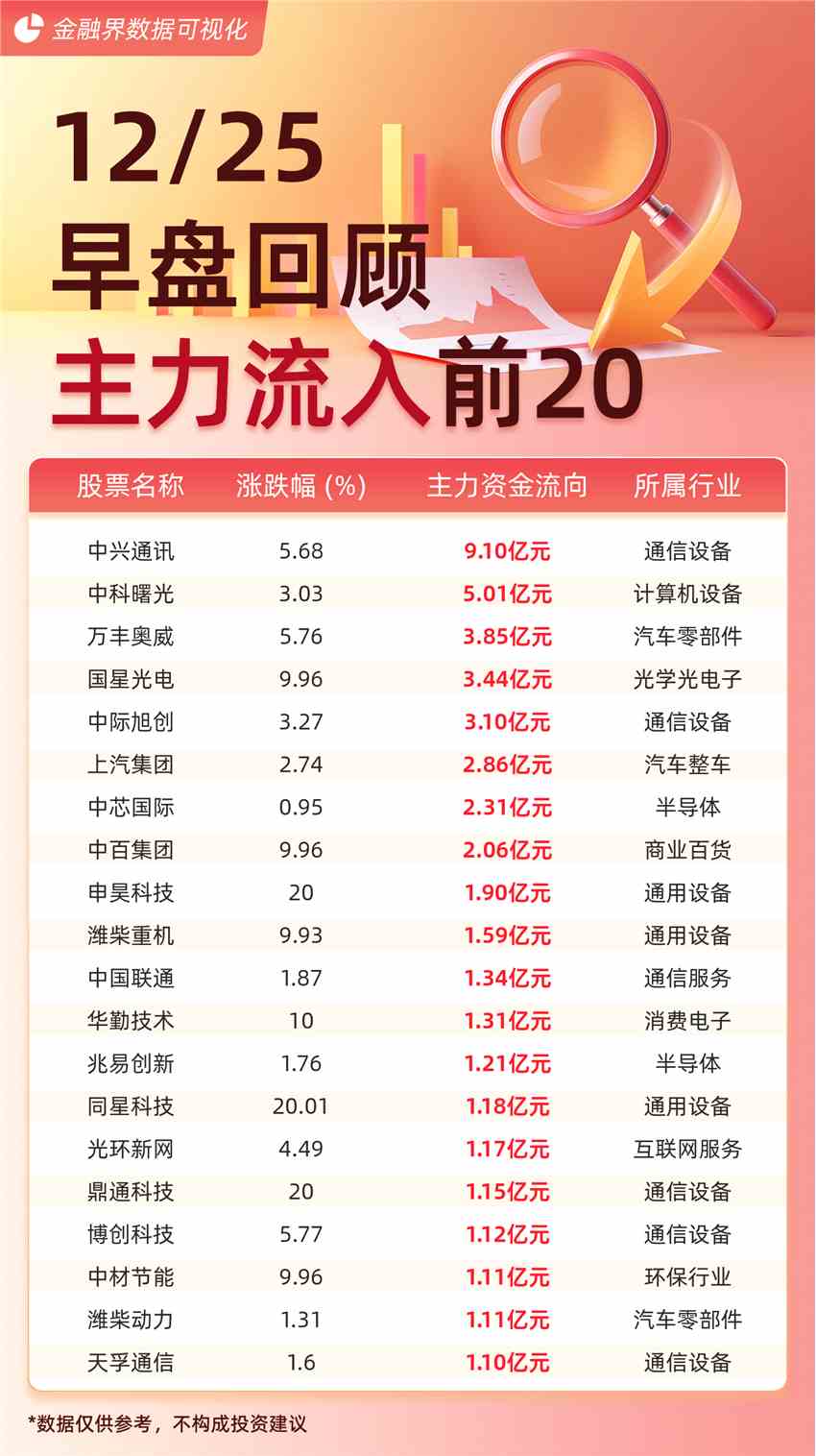 截至12月25日午間收盤,主力資金流入前20的股票分別為:中興通訊(000063)(9.10億元)、中科曙光(603019)(5.01億元)、萬豐奧威(002085)(3.85億元)、國星光電(002449)(3.44億元)、中際旭創(chuàng)(300308)(3.10億元)、上汽集團(600104)(2.86億元)、中芯國際(2.31億元)、中百集團(000759)(2.06億元)、申昊科技(300853)(1.90億元)、濰柴重機(000880)(1.59億元)、中國聯(lián)通(600050)(1.34億元)、華勤技術(603296)(1.31億元)、兆易創(chuàng)新(603986)(1.21億元)、同星科技(301252)(1.18億元)、光環(huán)新網(wǎng)(300383)(1.17億元)、鼎通科技(1.15億元)、博創(chuàng)科技(300548)(1.12億元)、中材節(jié)能(603126)(1.11億元)、濰柴動力(000338)(1.11億元)、天孚通信(300394)(1.10億元)。