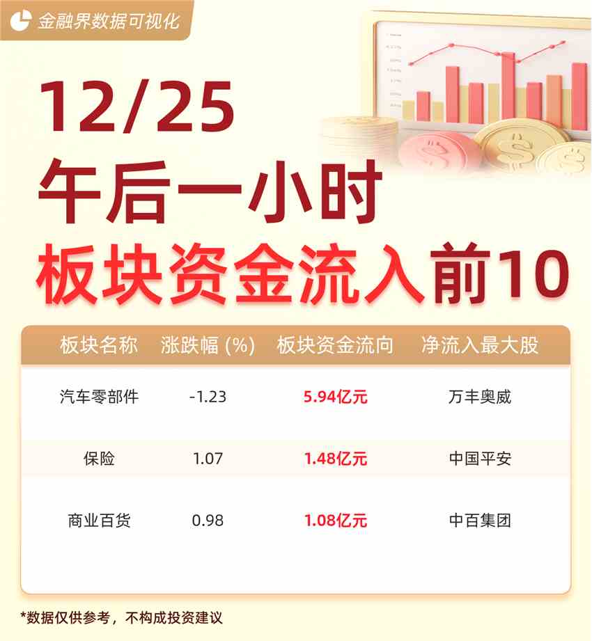 截至12月25日午后一小時,大盤主力資金凈流出471.81億元。主力資金流入前十大板塊分別為:汽車零部件(5.94億元)、保險(1.48億元)、商業(yè)百貨(1.08億元)。