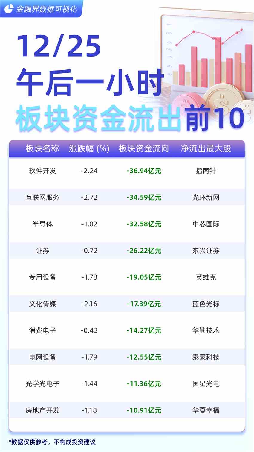 摘要: 截至12月25日午后一小時,大盤主力資金凈流出471.81億元。主力資金流出前十大板塊分別為:軟件開發(fā)(-36.94億元)、互聯(lián)網(wǎng)服務(-34.59億元)、半導體(-32.58億元)、證券(-26.2