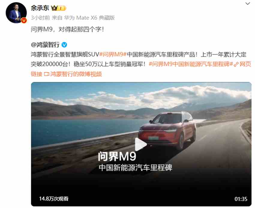 據(jù)鴻蒙智行,問界M9上市一年累計大定突破20萬臺。余承東轉(zhuǎn)發(fā)該消息,并寫道:“問界M9,對得起那四個字!”