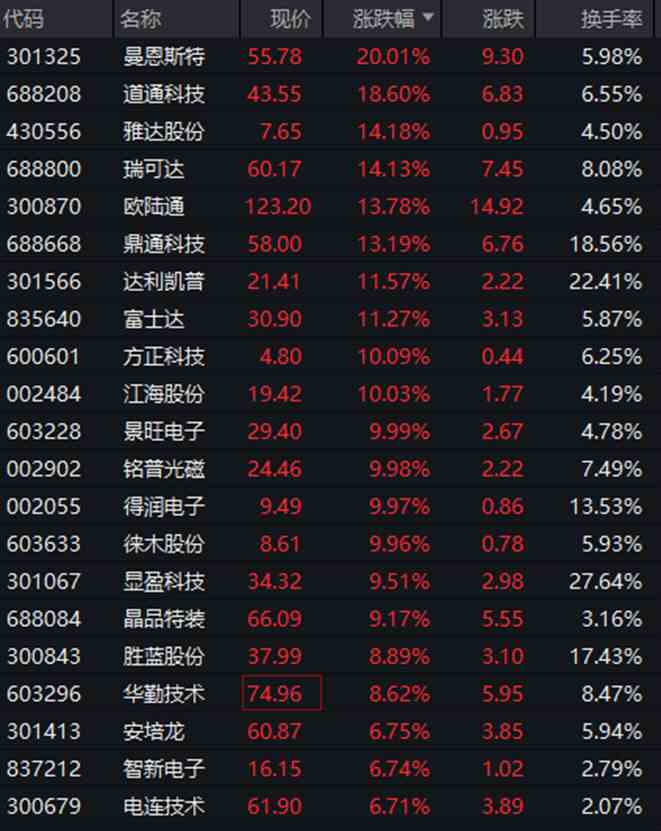 此外,消費電子、電子元器件板塊強(qiáng)勢拉升,曼恩斯特(301325)20CM漲停,方正科技(600601)、景旺電子(603228)、得潤電子(002055)等多股漲停。