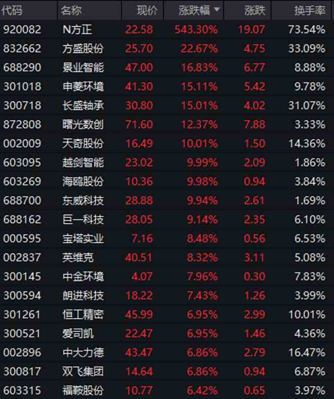 機(jī)器人概念再度活躍,方盛股份、景業(yè)智能、申菱環(huán)境(301018)、長盛軸承(300718)等漲超14%,越劍智能(603095)、天奇股份(002009)、海鷗股份(603269)等紛紛漲停。
