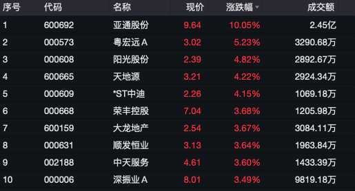 房地產(chǎn)板塊拉升,亞通股份(600692)漲停,陽(yáng)光股份(000608)、粵宏遠(yuǎn)A、陽(yáng)光股份、天地源(600665)等個(gè)股漲逾4%。