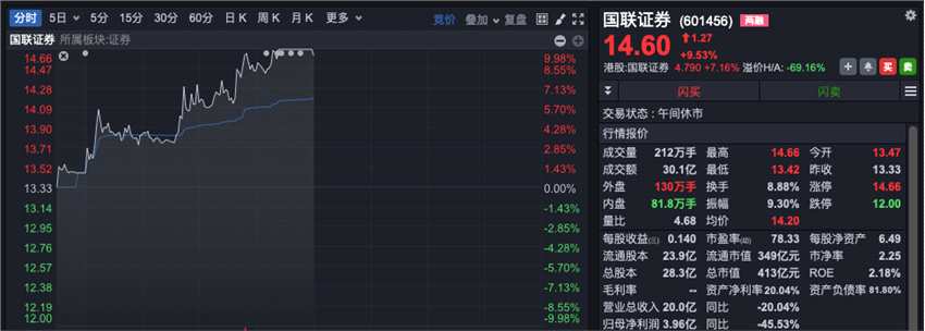 券商股盤中拉升,國聯(lián)證券(601456)一度漲停,國盛金控(002670)、紅塔證券(601236)、東方財(cái)富(300059)等跟漲。