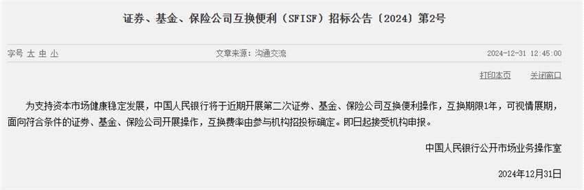 人民銀行12月31日消息,為支持資本市場健康穩(wěn)定發(fā)展,中國人民銀行將于近期開展第二次證券、基金、保險公司互換便利操作,互換期限1年,可視情展期,面向符合條件的證券、基金、保險公司開展操作,互換費率由參與機構(gòu)招投標(biāo)確定。即日起接受機構(gòu)申報。