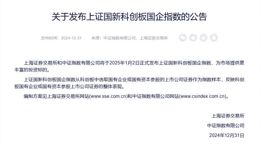 上交所、中證指數(shù)將于2025年1月2日正式發(fā)布上證國新科創(chuàng)板國企指數(shù)