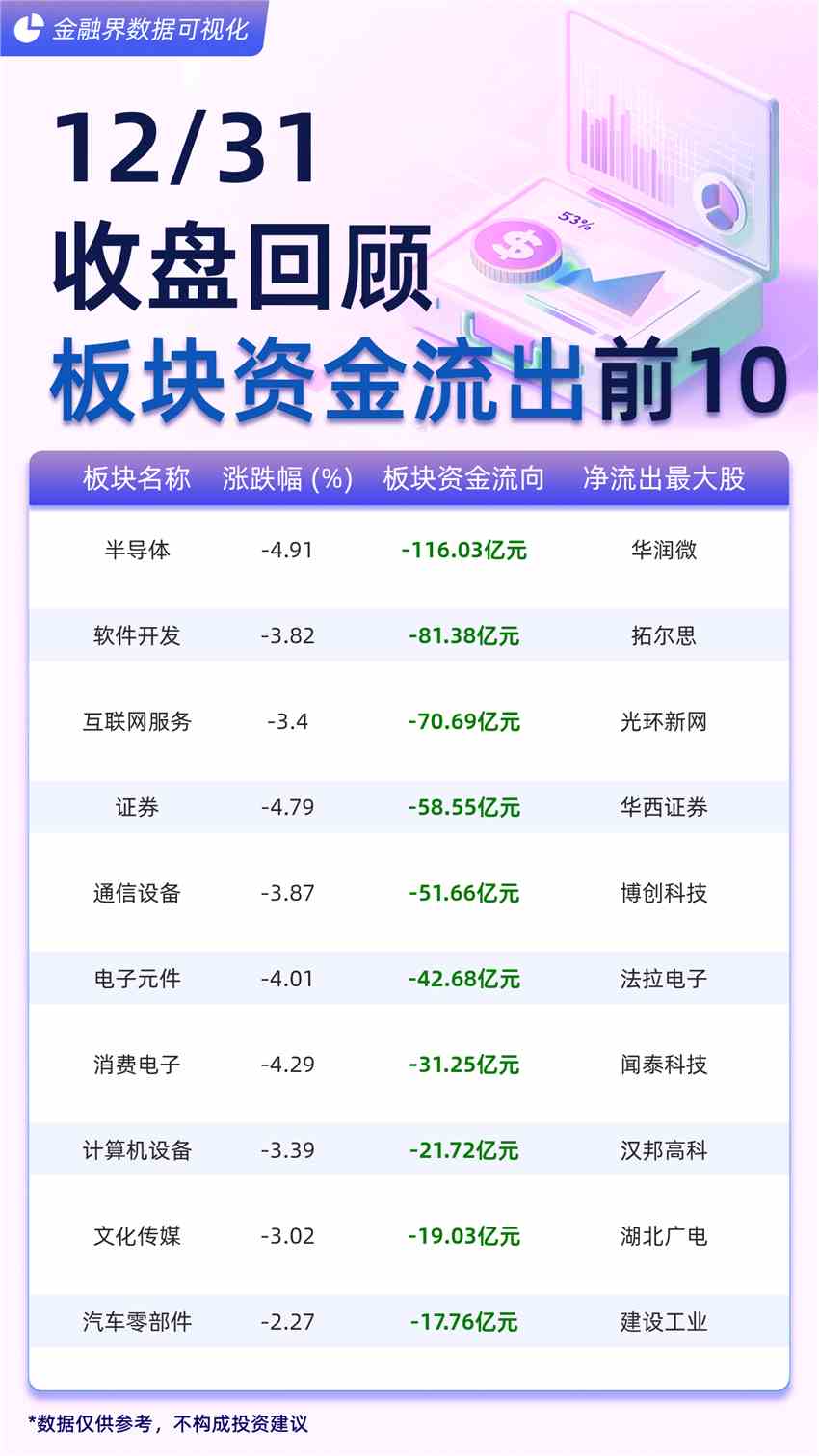 摘要: 截至12月31日收盤回顧,大盤主力資金凈流出919.48億元。主力資金流出前十大板塊分別為:半導(dǎo)體(-116.03億元)、軟件開發(fā)(-81.38億元)、互聯(lián)網(wǎng)服務(wù)(-70.69億元)、證券(-58.5