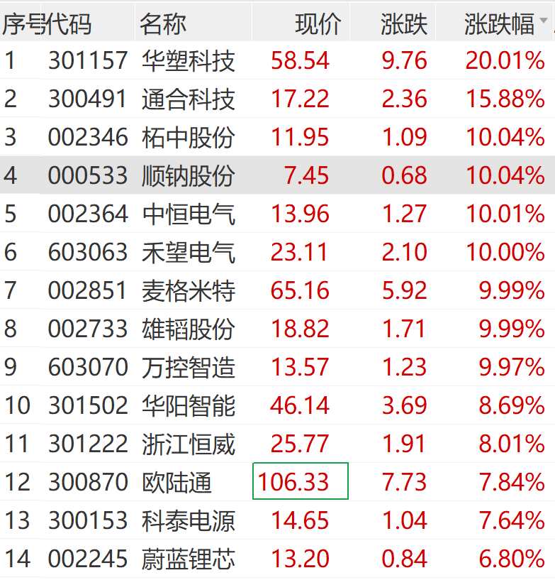 上午,電力設(shè)備板塊普遍走高。除順鈉股份外,華塑科技(301157)、中恒電氣(002364)、禾望電氣(603063)、雄韜股份(002733)等多股漲停。