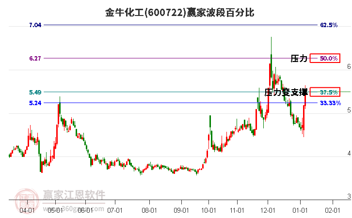 如圖:金牛化工短期反彈上穿波段百分比工具5.49元關(guān)鍵位