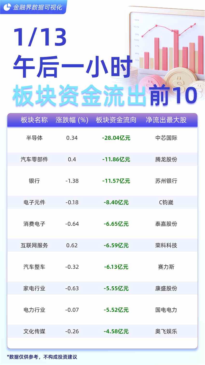 摘要: 截至1月13日午后一小時(shí),大盤主力資金凈流出161.66億元。主力資金流出前十大板塊分別為:半導(dǎo)體(-28.04億元)、汽車零部件(-11.86億元)、銀行(-11.57億元)、電子元件(-8.40億