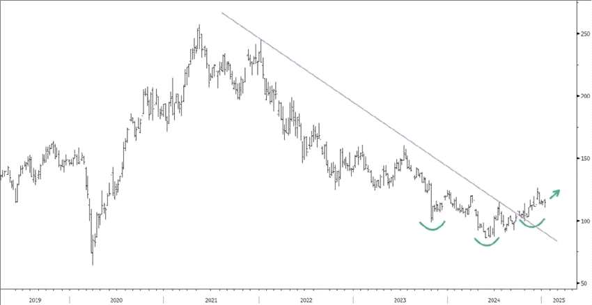 下方的圖表完美詮釋了“由熊轉(zhuǎn)?!蹦孓D(zhuǎn)買入的定義。我們的目標(biāo)價格為135美元上下。