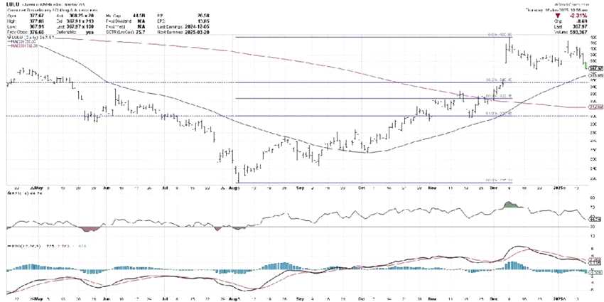在12月初首次測試406美元的阻力位后,Lululemon出現(xiàn)回撤,并在本月初再次測試這一上行目標。我常說,看漲的股票不僅會漲到阻力位,還會突破阻力位。鑒于Lululemon未能突破這一上行目標,我們將認為圖表呈看跌趨勢,直到有證據(jù)證明相反。