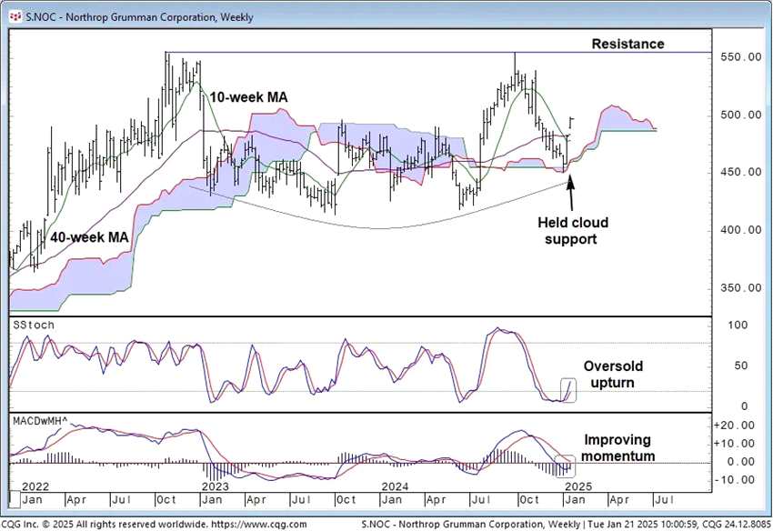 NOC的強(qiáng)勁反彈在周線云圖模型的關(guān)鍵支撐位上方展開,支撐位約在460美元附近。周二的跳空高開突破了初步阻力位,即50日均線(圖中以10周均線表示)。這一突破伴隨著周線隨機(jī)指標(biāo)的新一輪超跌上揚(yáng),這是一個(gè)中期看漲信號(hào),表明該股三個(gè)月的回調(diào)階段已基本結(jié)束。