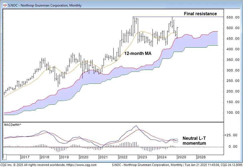 從月線MACD來看,目前長期動(dòng)能處于中性狀態(tài),但我們預(yù)計(jì)中期內(nèi)股價(jià)將延續(xù)上漲趨勢,接近交易區(qū)間頂部。上升趨勢的可持續(xù)性將取決于NOC能否突破556美元水平的交易區(qū)間頂部。如果這一突破發(fā)生,月線MACD可能會(huì)明確轉(zhuǎn)為上行。