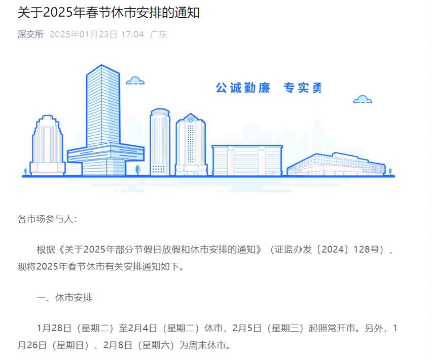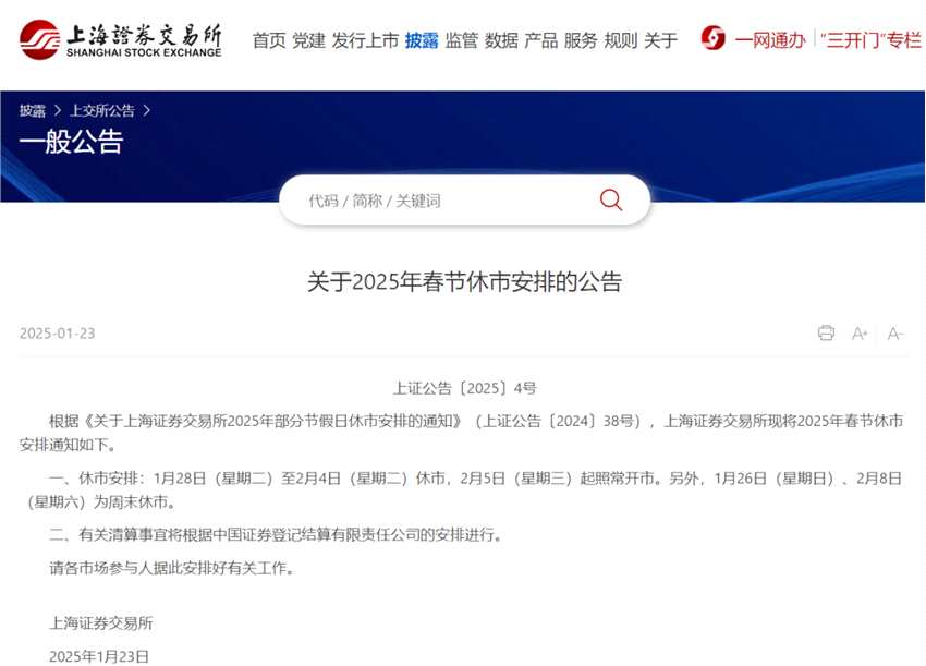1月23日,滬深北交易所分別發(fā)布關(guān)于2025年春節(jié)休市安排的通知。據(jù)通知,1月28日(星期二)至2月4日(星期二)休市,2月5日(星期三)起照常開市。另外,1月26日(星期日)、2月8日(星期六)為周末休市。