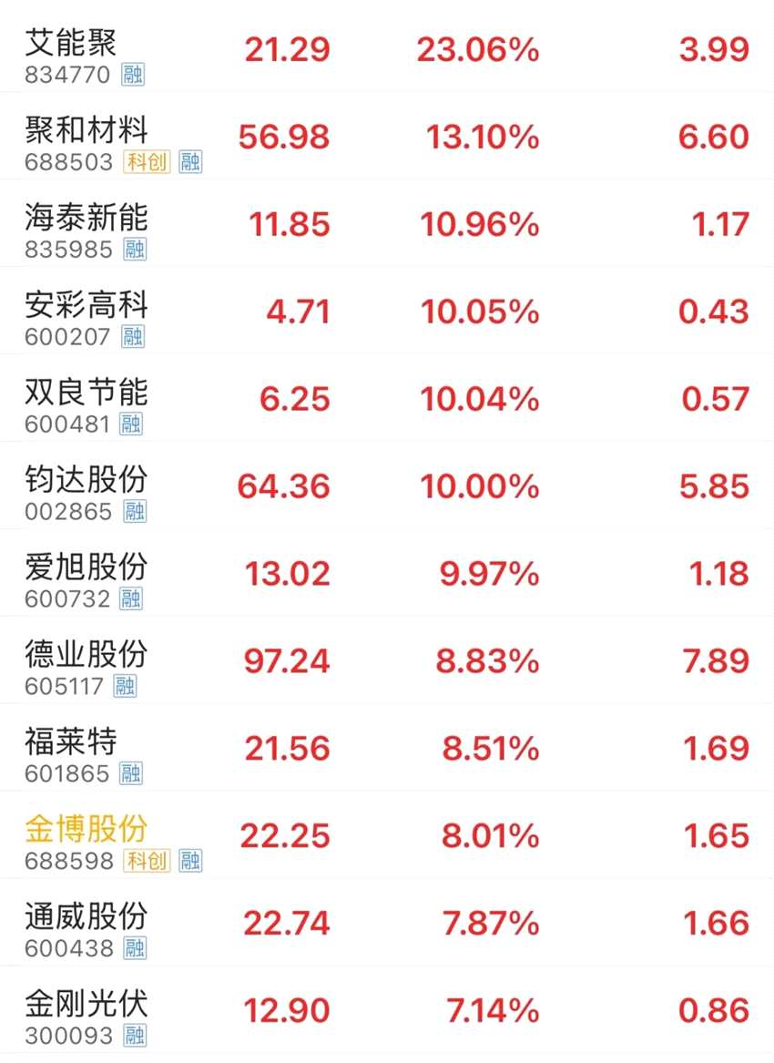 新能源概念股盤中同樣走勢活躍,光伏方向領漲。截至收盤,艾能聚漲超20%,聚和材料、海泰新能漲超10%,安彩高科(600207)、雙良節(jié)能(600481)、鈞達股份(002865)、愛旭股份(600732)漲停。