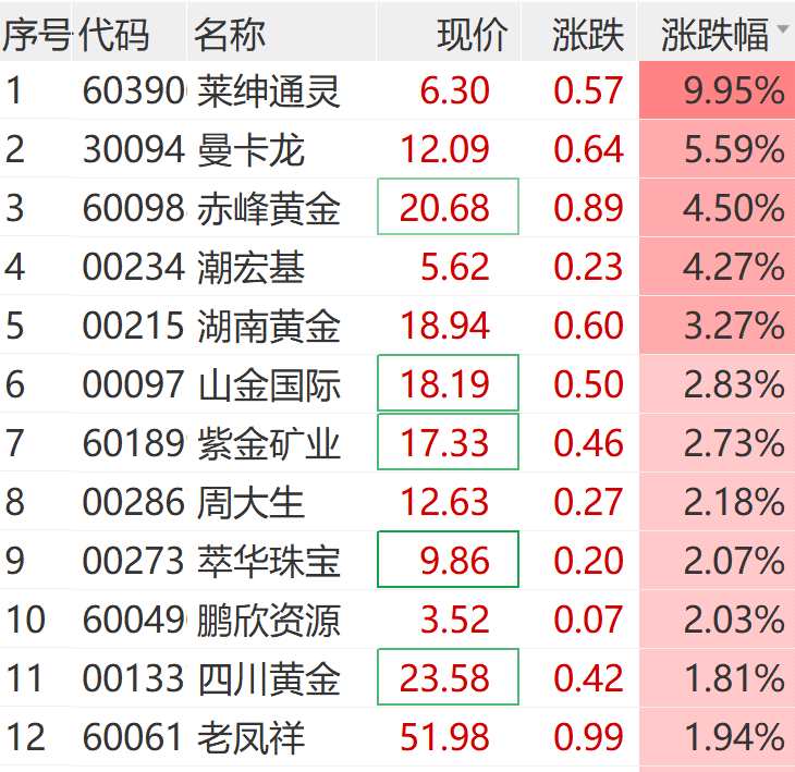 2月11日,黃金股盤(pán)初走高,黃金珠寶指數(shù)漲幅居前。萊紳通靈(603900)直線走高,拉出漲停板;曼卡龍(300945)、潮宏基(002345)、赤峰黃金(600988)、【山金國(guó)際(000975)、股吧】(000975)等多股大漲。