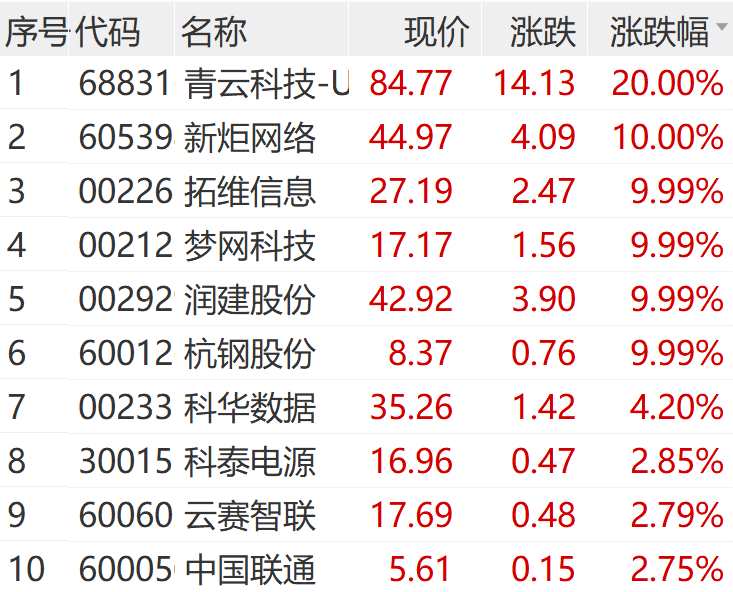 另外,上午算力板塊持續(xù)火熱,青云科技連續(xù)5日20CM漲停,新炬網(wǎng)絡(luò)(605398)9連板,拓維信息(002261)、夢(mèng)網(wǎng)科技(002123)、杭鋼股份(600126)等5連板。