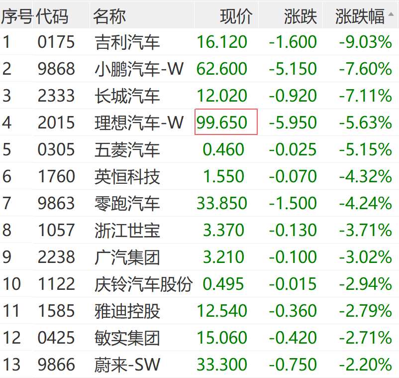 港股汽車(chē)板塊同步走低,吉利汽車(chē)盤(pán)中跌超9%,長(zhǎng)城汽車(chē)(601633)、小鵬汽車(chē)、理想汽車(chē)等跌幅居前。
