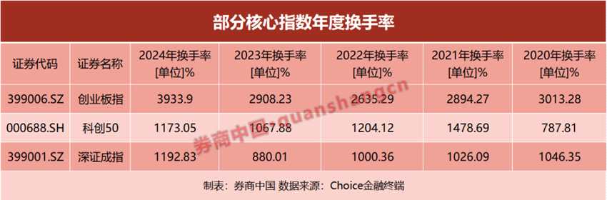 全部股票買賣各一次就是換手100%,而創(chuàng)業(yè)板指數(shù)2021年的換手率為3934%。按照單邊0.03%的傭金率,雙邊0.1%的印花稅來算,每次買賣的交易成本至少為千0.16%。在最活躍的創(chuàng)業(yè)板中,2024年的換手率為3934%,那么整體交易成本約為6.29%。