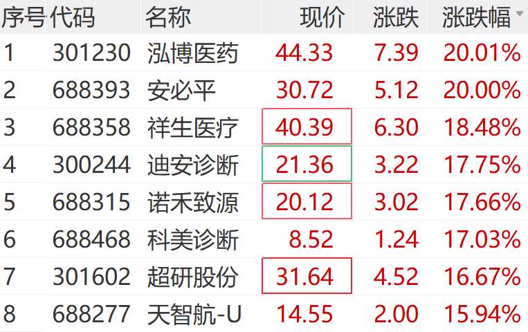 個(gè)股方面,泓博醫(yī)藥(301230)、安必平走出20CM漲停,祥生醫(yī)療、諾禾致源、【超研股份(301602)、股吧】(301602)等多股大漲。