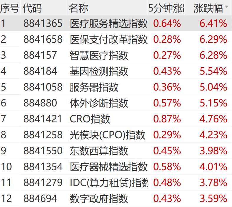 盤(pán)面上,上午醫(yī)藥生物板塊走高,智慧醫(yī)療、醫(yī)療服務(wù)、基因測(cè)序等概念全線(xiàn)大漲,電信、教育、通信等板塊走強(qiáng);貴金屬回調(diào),食品、汽車(chē)、煤炭等板塊不振。