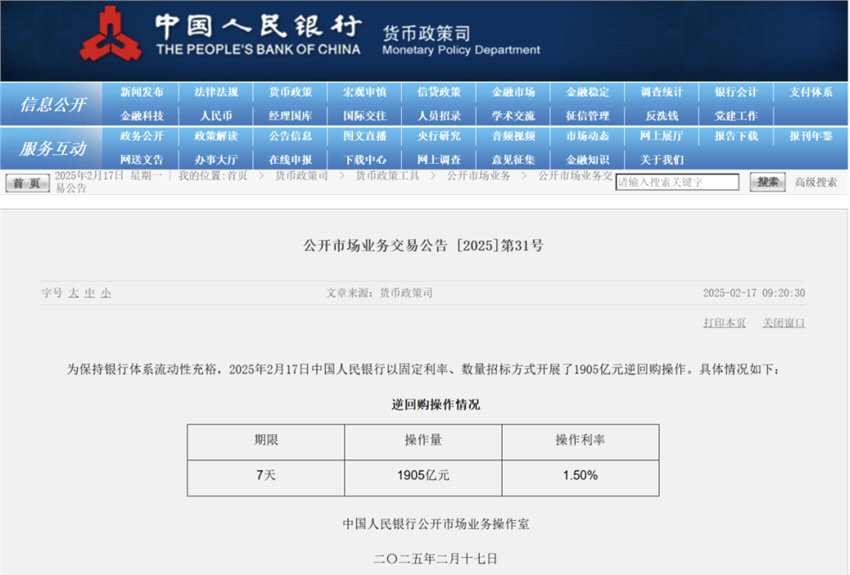 首先來(lái)看央行動(dòng)作:為保持銀行體系流動(dòng)性充裕,2月17日中國(guó)人民銀行開(kāi)展1905億元7天期逆回購(gòu)操作,操作利率為1.5%。數(shù)據(jù)顯示,當(dāng)日2290億元逆回購(gòu)到期。