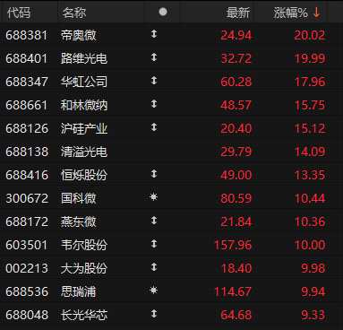 午后,芯片概念大幅走強(qiáng),成為帶動(dòng)股指上漲的重要力量。截至收盤(pán),申萬(wàn)半導(dǎo)體指數(shù)大漲4.37%,帝奧微、路維光電收獲20%幅度漲停,韋爾股份、大為股份等同樣漲停。細(xì)分龍頭華虹公司股價(jià)收漲17.96%,盤(pán)中刷新歷史新高,公司總市值站上1000億元。