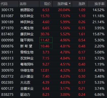 農(nóng)業(yè)板塊集體高開,朗源股份(300175)20CM漲停,秋樂種業(yè)、【神農(nóng)種業(yè)(300189)、股吧】(300189)、大禹生物等跟漲。