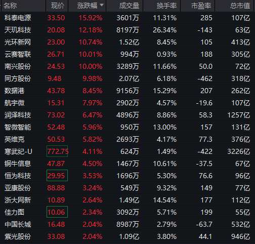 AI算力板塊走高,科泰電源(300153)、天璣科技(300245)、光環(huán)新網(wǎng)(300383)漲幅居前,云賽智聯(lián)(600602)、南興股份(002757)、同方股份(600100)漲停。