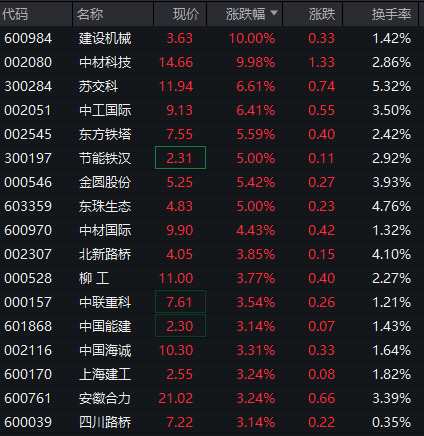 大基建概念股異動拉升,北方國際(000065)實(shí)現(xiàn)5天3板,建設(shè)機(jī)械(600984)、中材科技(002080)漲停,蘇交科(300284)、中工國際(002051)、東方鐵塔(002545)等跟漲。