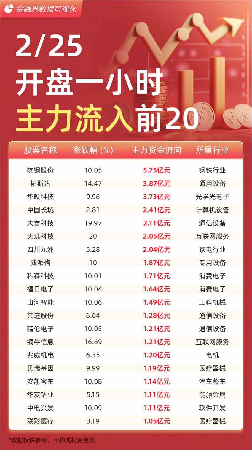 摘要: 截至2月25日開盤一小時(shí),主力資金流入前20的股票分別為:杭鋼股份(600126)(5.75億元)、拓斯達(dá)(300607)(3.87億元)、華映科技(000536)(3.73億元)、中國長城(0000