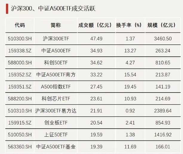 從成交額來看,滬深300ETF(510300)領(lǐng)先,中證A500ETF(159338)、科創(chuàng)50ETF(588000)等也較為活躍。