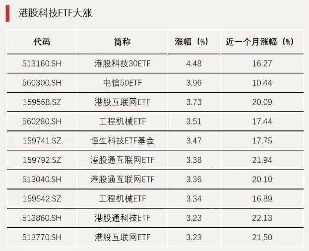 港股表現(xiàn)更加亮眼,港股恒生科技指數(shù)大漲4.02%,港股科技30ETF(513160)、港股互聯(lián)網(wǎng)ETF(159568)等漲幅居前,成分股中中芯國際、小米集團、美團等漲幅超過5%。
