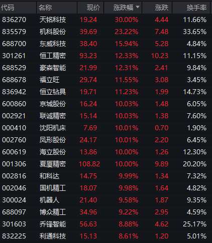 此外,工業(yè)機(jī)械板塊表現(xiàn)活躍,天銘科技30CM漲停,機(jī)科股份漲超20%,京城股份(600860)、沈陽機(jī)床(000410)、鳳形股份(002760)、海立股份(600619)等多股漲停。